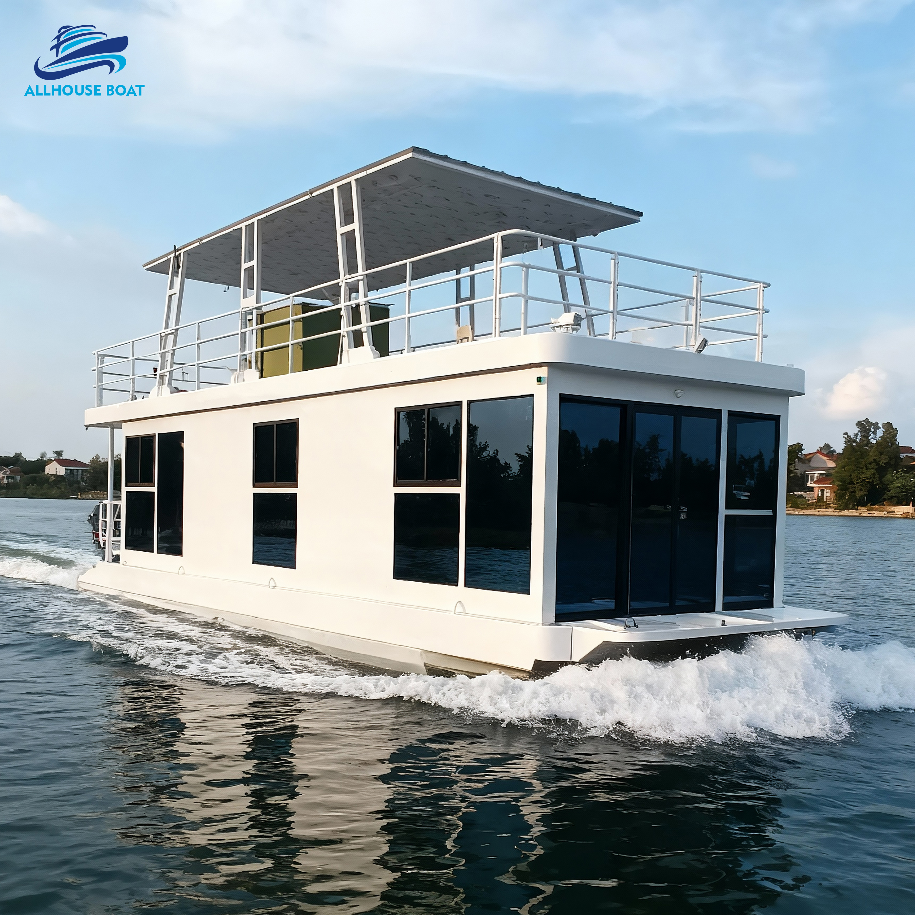 Double-layer design: The upper open viewing deck is equipped with comfortable seats and a sunshade roof, which is the perfect place to enjoy the sun and water view. The lower floor is the indoor living area with large windows, providing residents with a panoramic view.